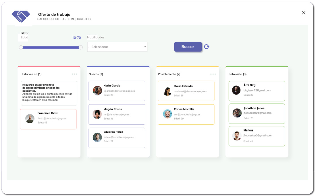 Med et enkelt klik og træk flytter du de jobsøgende i den kolonne, du ønsker. Dette giver dig mulighed for at have et effektivt overblik over dine kandidater. Spar tid ved blot at sende en note til hele kolonnen og lade kandidaterne vide, hvor de står.